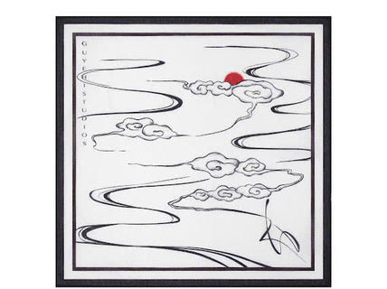 • The minimalist black-and-white palette, accentuated with a vibrant red sun, creates a harmonious balance between strength and serenity — a signature of GUYEHI STUDIOS.