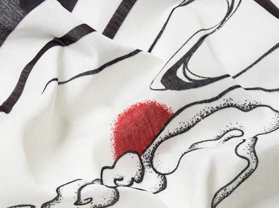 • The Bandana Scarf draws inspiration from the meditative beauty of Eastern art, portraying the image of a red sun amidst drifting clouds — a symbol of new beginnings, hope, and tranquility.