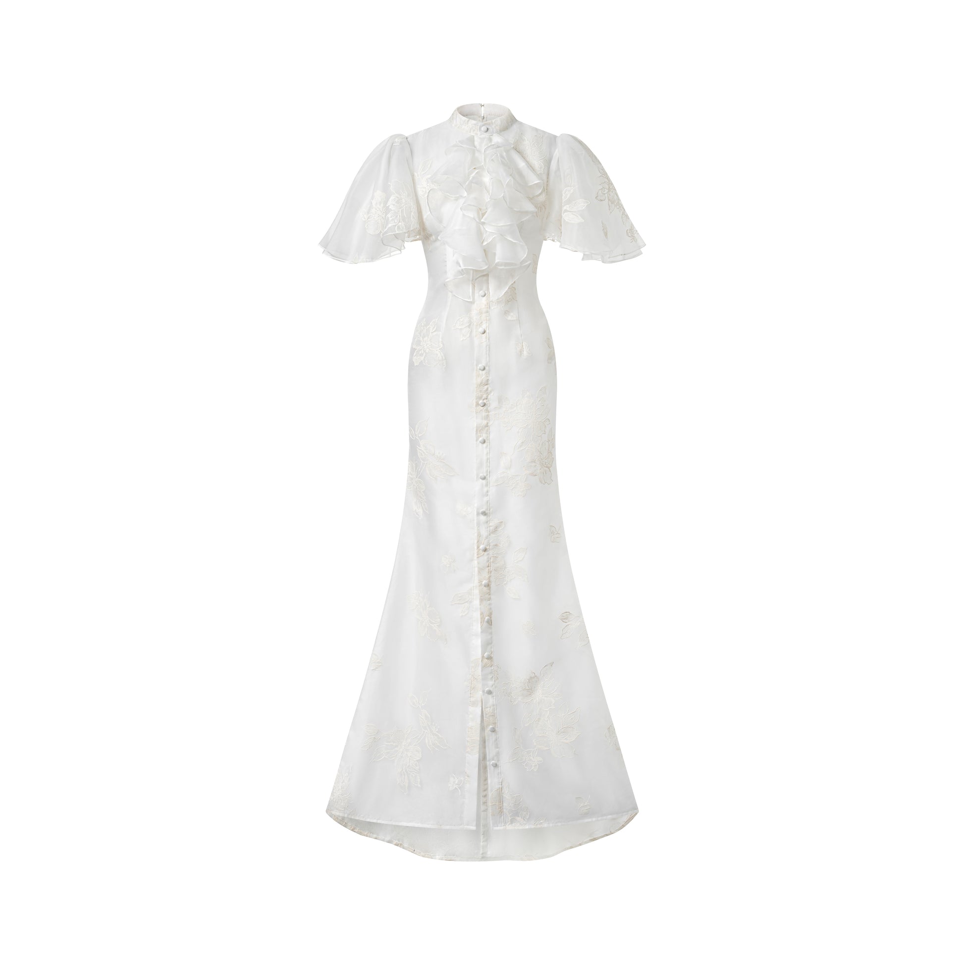 • Front Details: Button-down closure with ruffle accents at the chest and graceful puff sleeves.