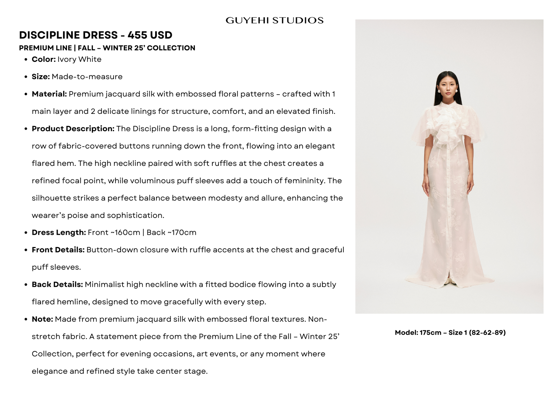 • Mô tả sản phẩm: Discipline Dress là thiết kế đầm dài ôm sát, hàng nút bọc chạy dọc phía trước cùng tà váy thướt tha mang đến vẻ đẹp kiêu kỳ. Cổ cao kết hợp bèo nhún trước ngực tạo điểm nhấn ấn tượng, tay bồng rủ nhẹ gợi sự thanh thoát và nữ tính. Tổng thể vừa kín đáo vừa gợi cảm, tôn trọn thần thái sang trọng của người mặc.