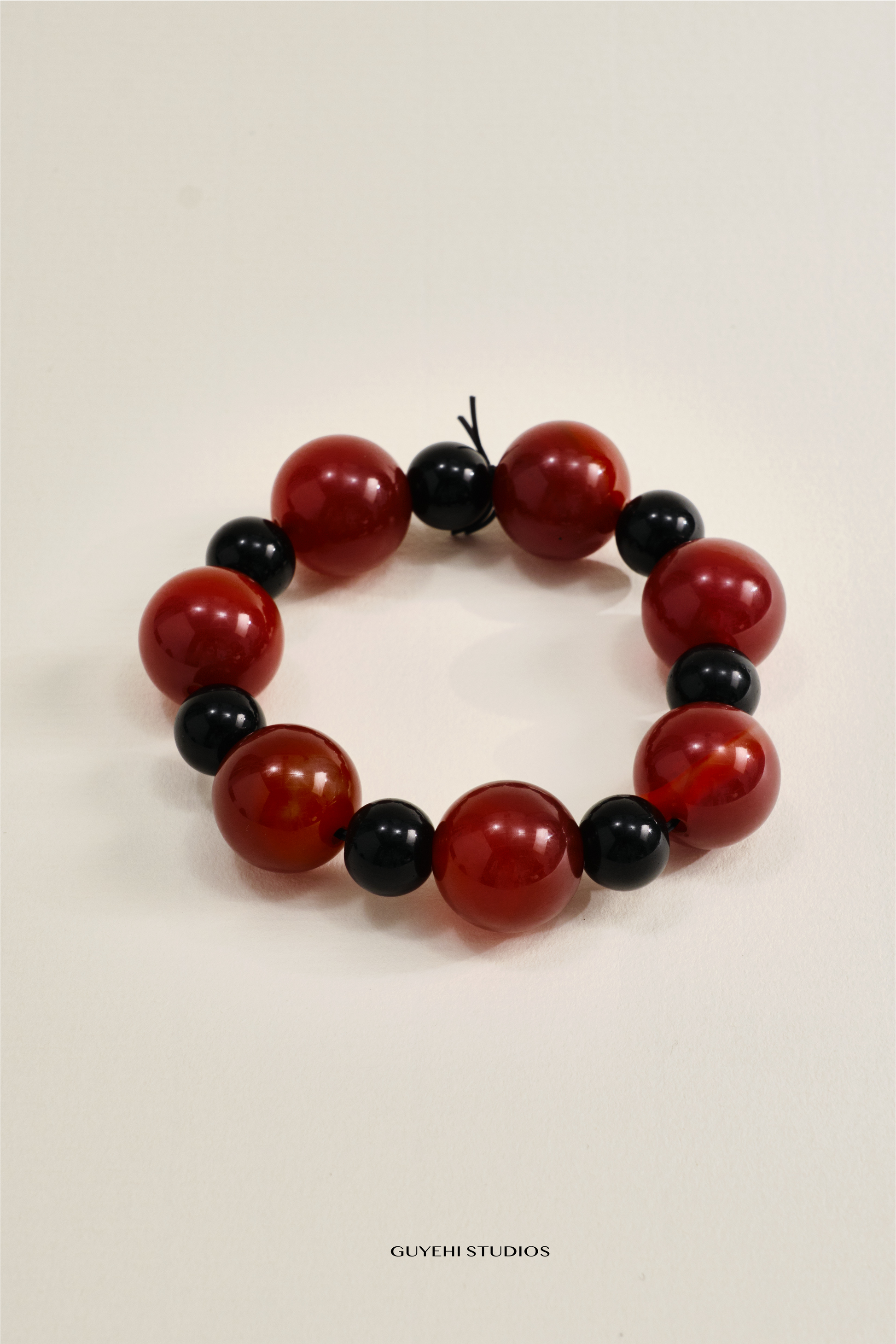 - Enju Bracelet is handcrafted from natural agate and cat’s eye stones, featuring a harmonious combination of deep warm red tones and subtle black accents, evoking a sense of balance, tranquility, and good fortune for new beginnings.