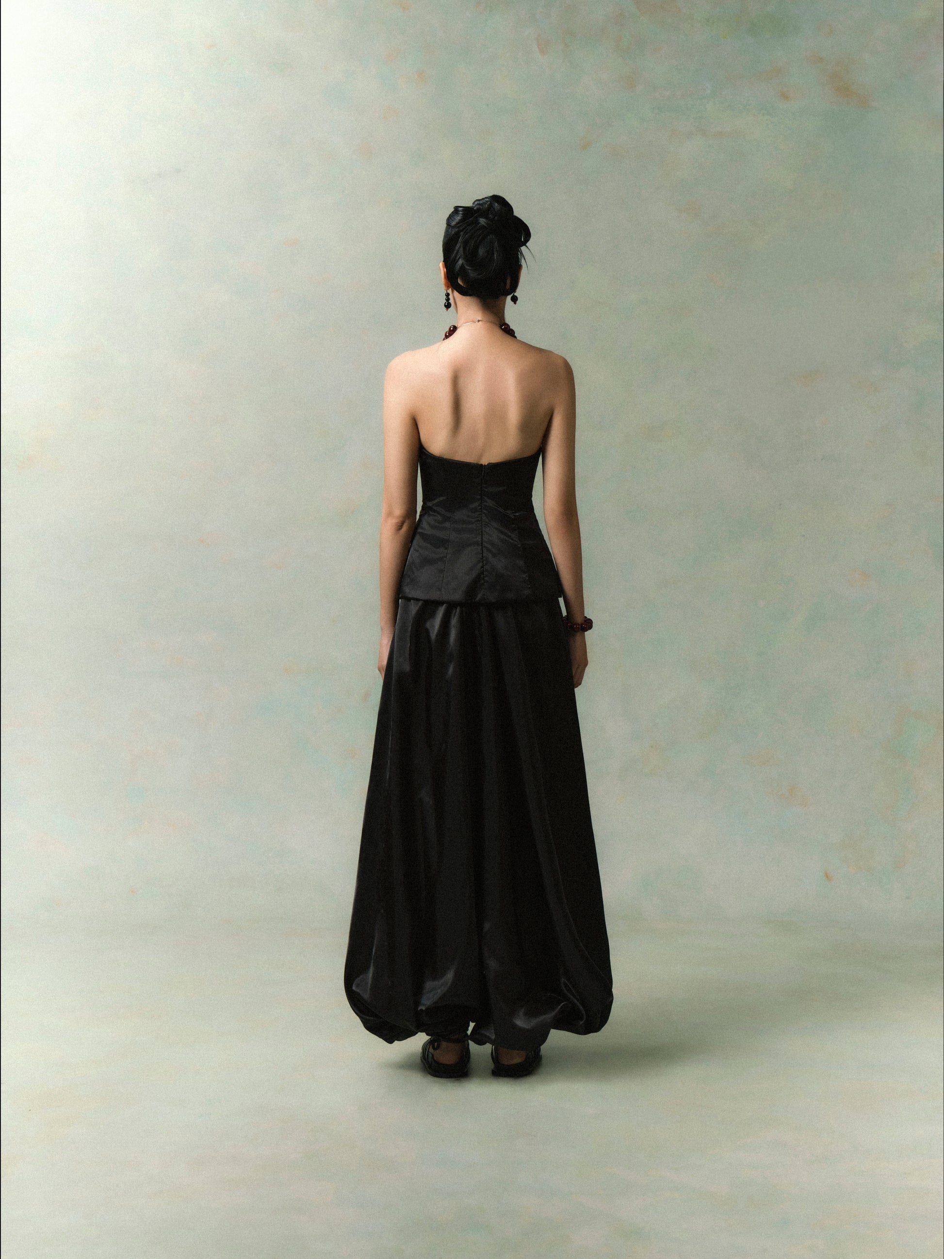 - Pants: Voluminous balloon silhouette crafted in gloss organza, offering light structure and striking movement. The waist features a drawstring tie that can be finished into a bow, adding a focal accent.