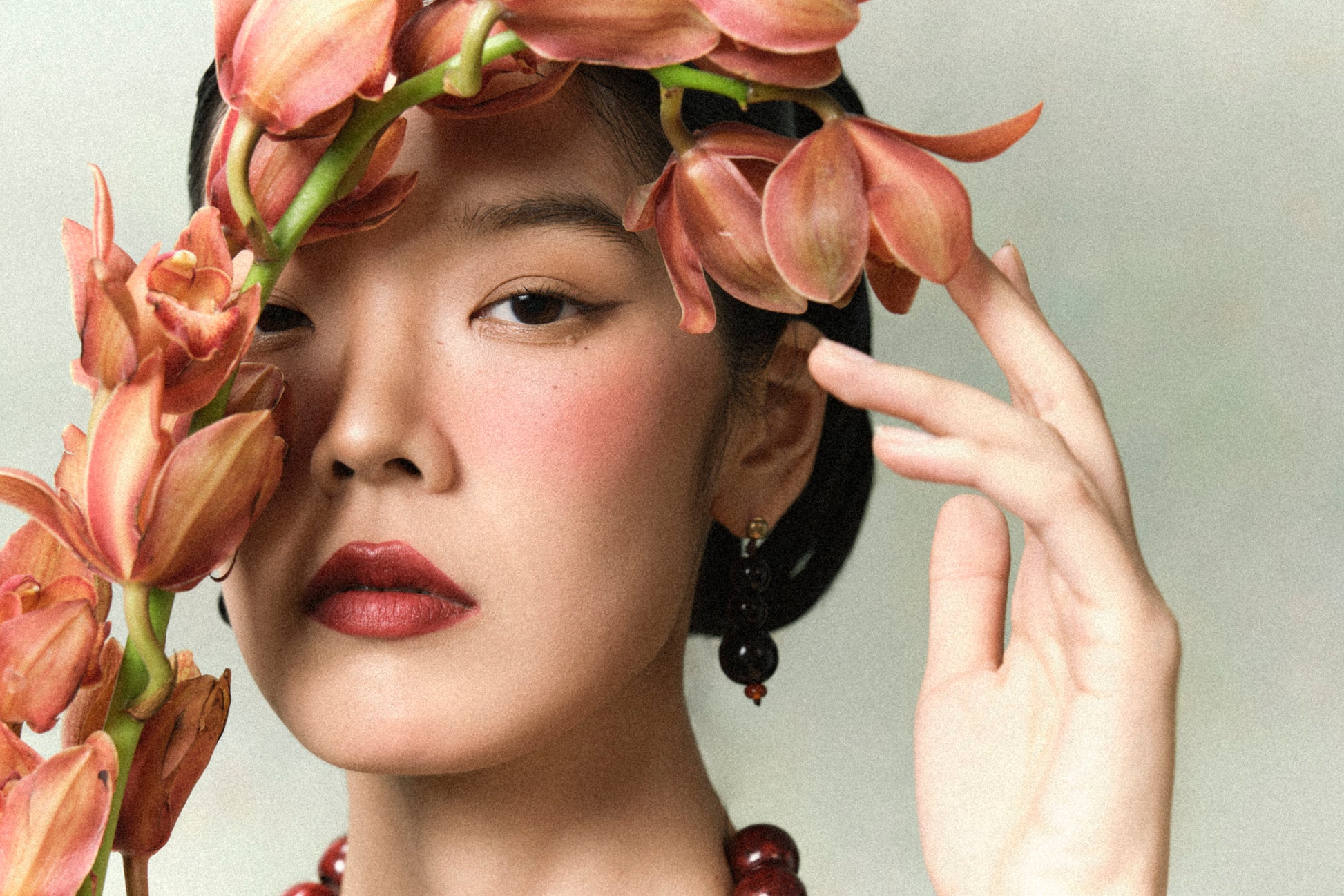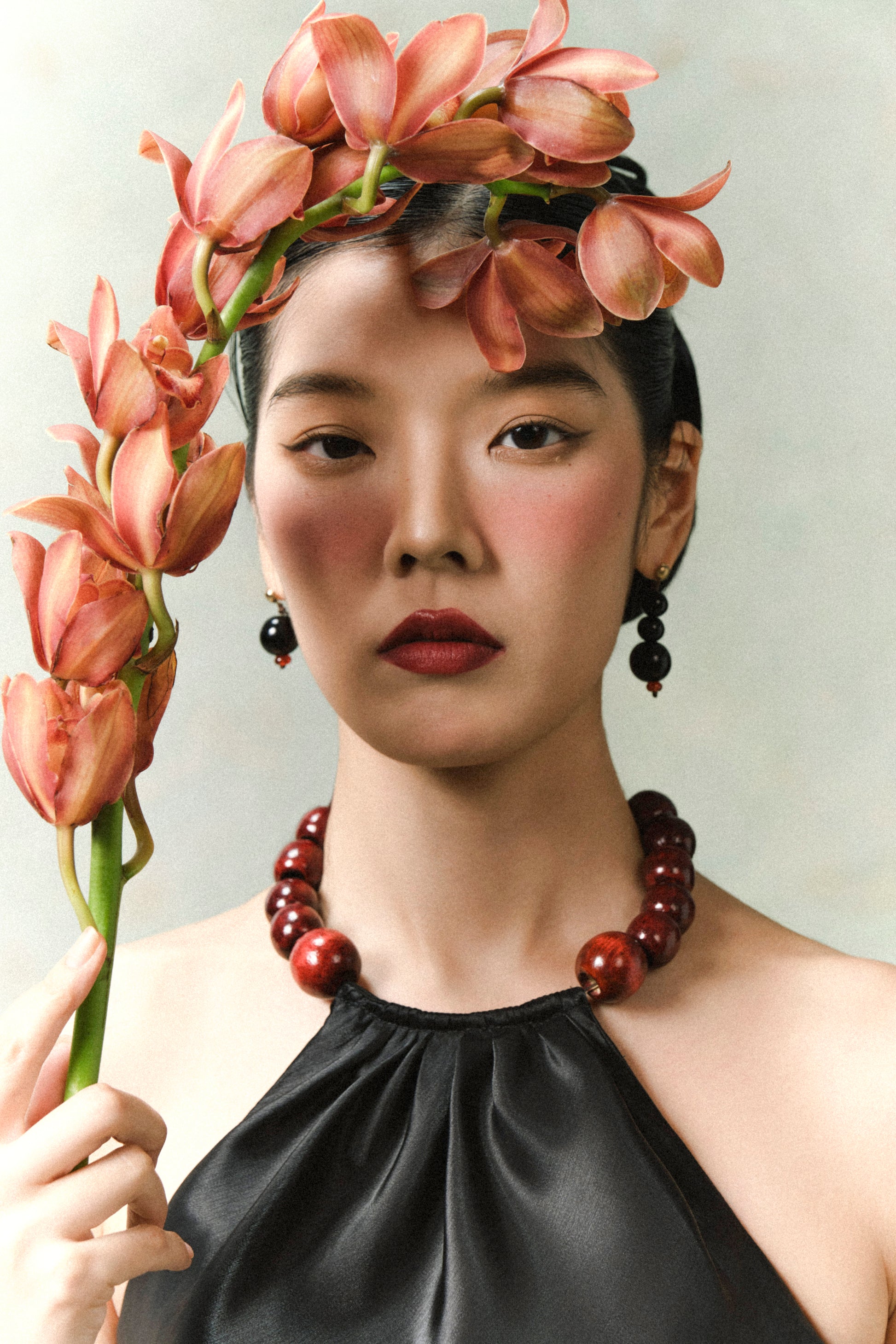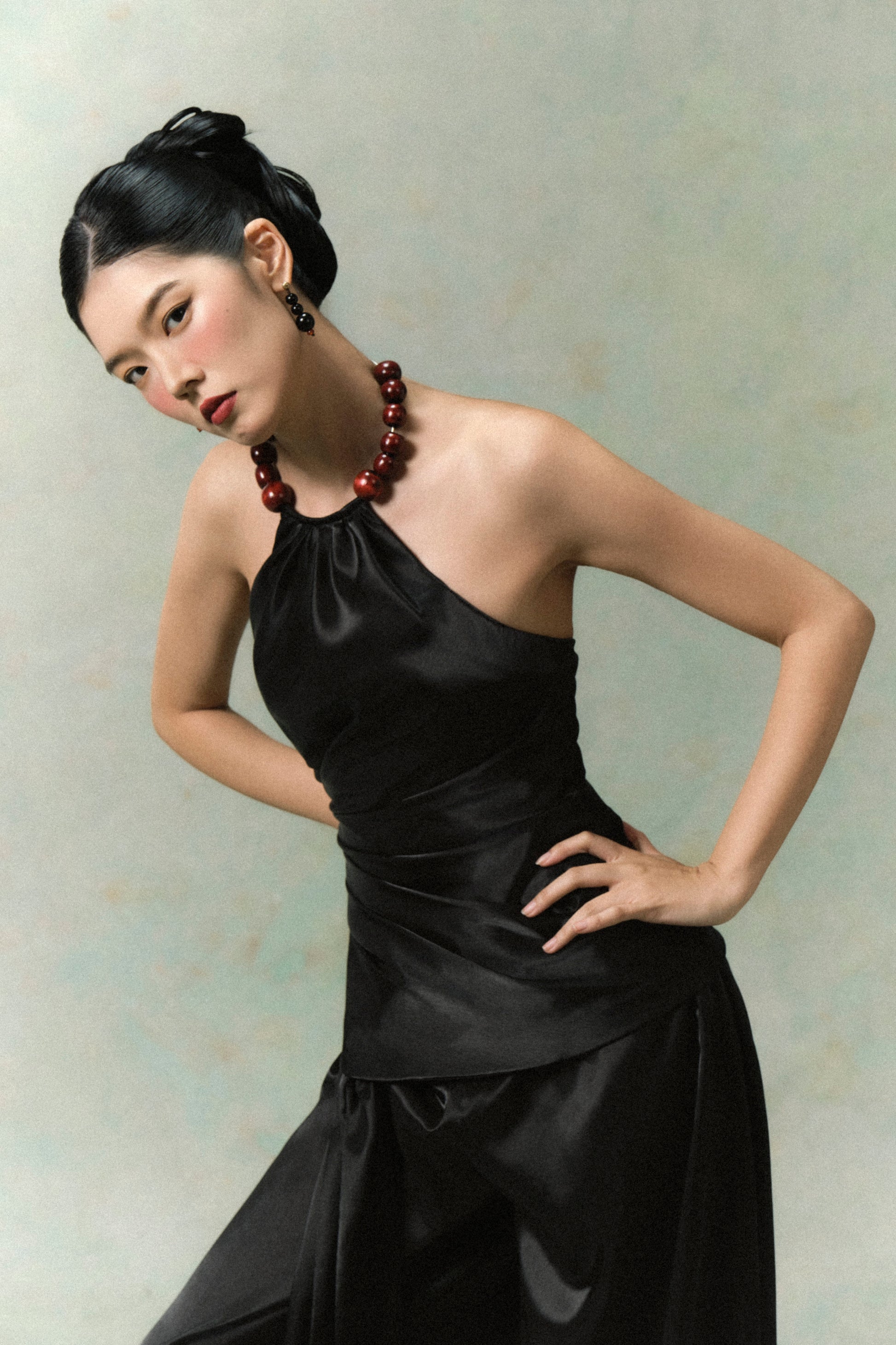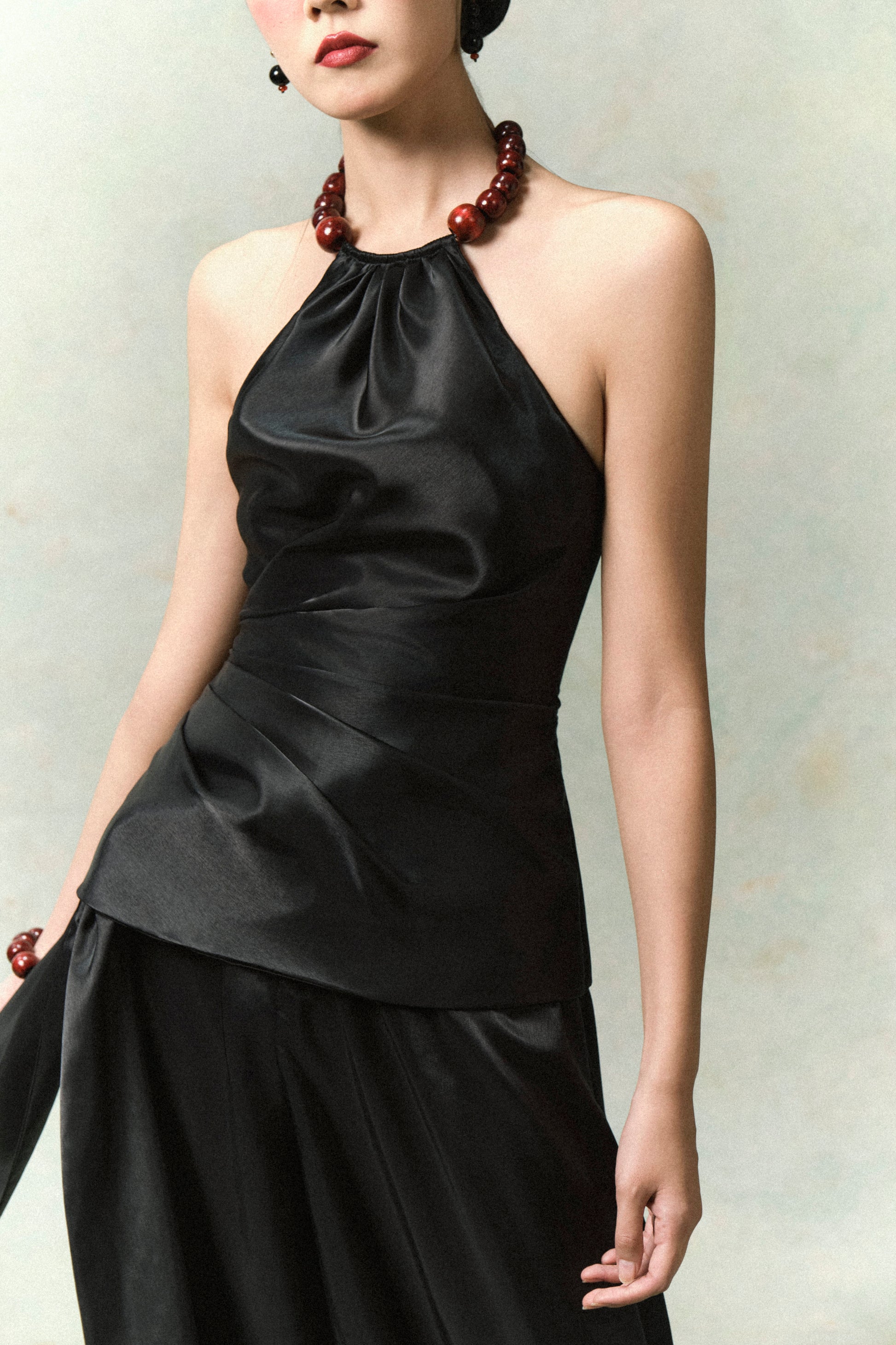 - Set được đi kèm với kiềng cổ hạt gỗ đỏ, một điểm nhấn cân bằng chất liệu organza bóng, vừa mộc mạc vừa sang trọng.