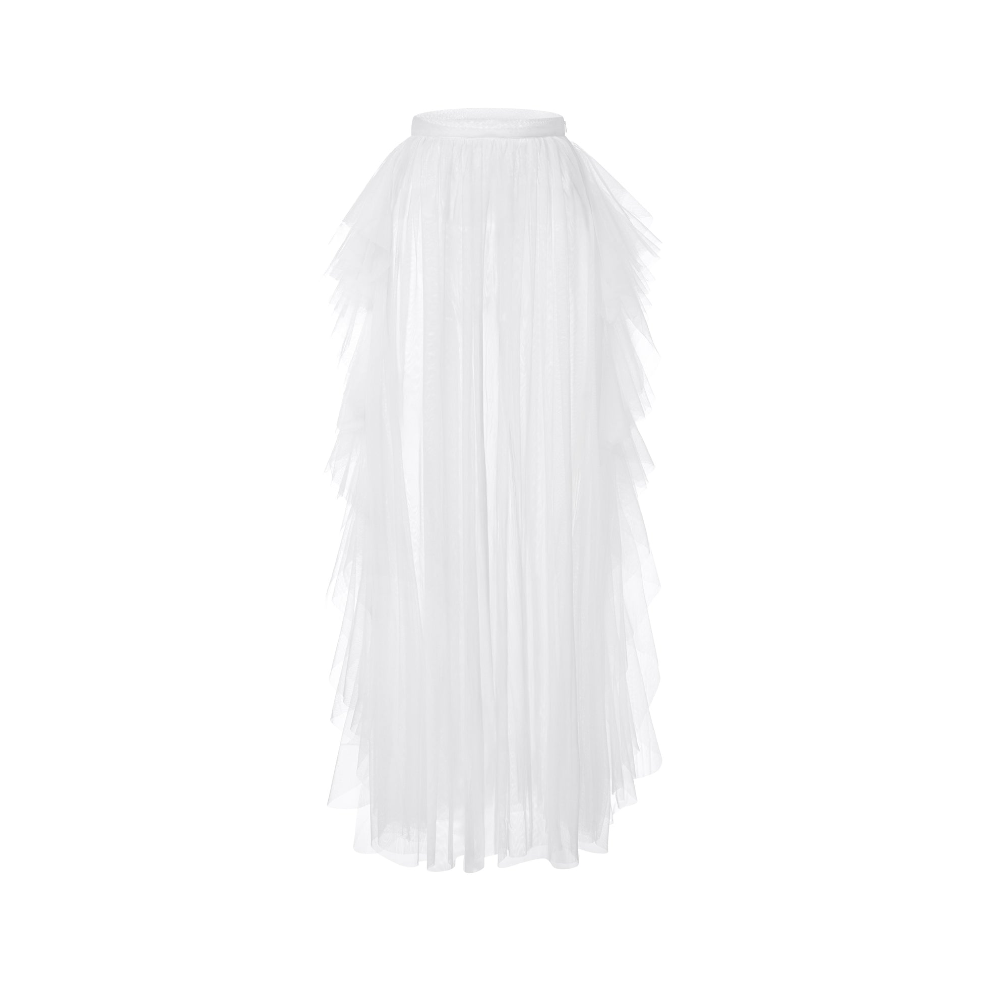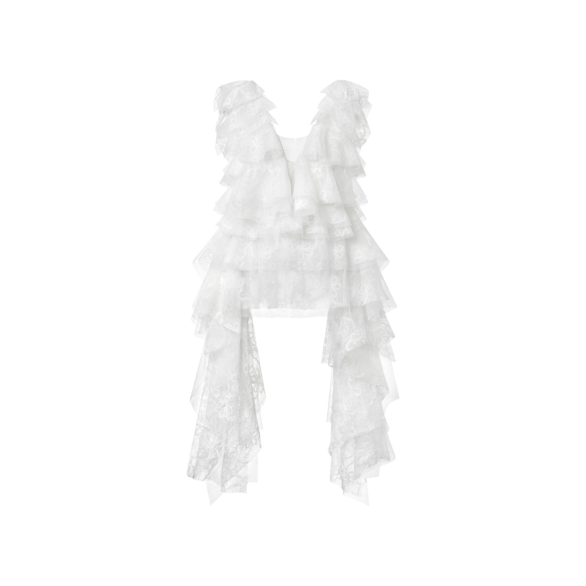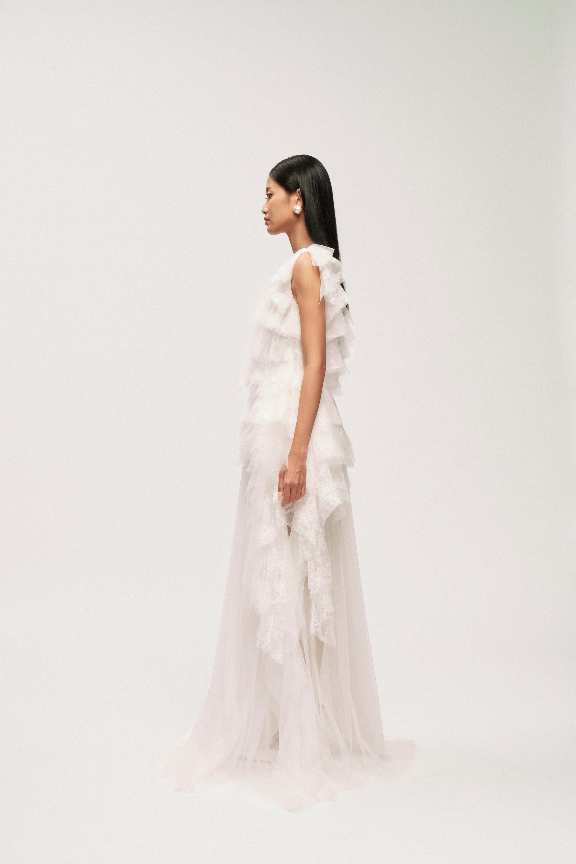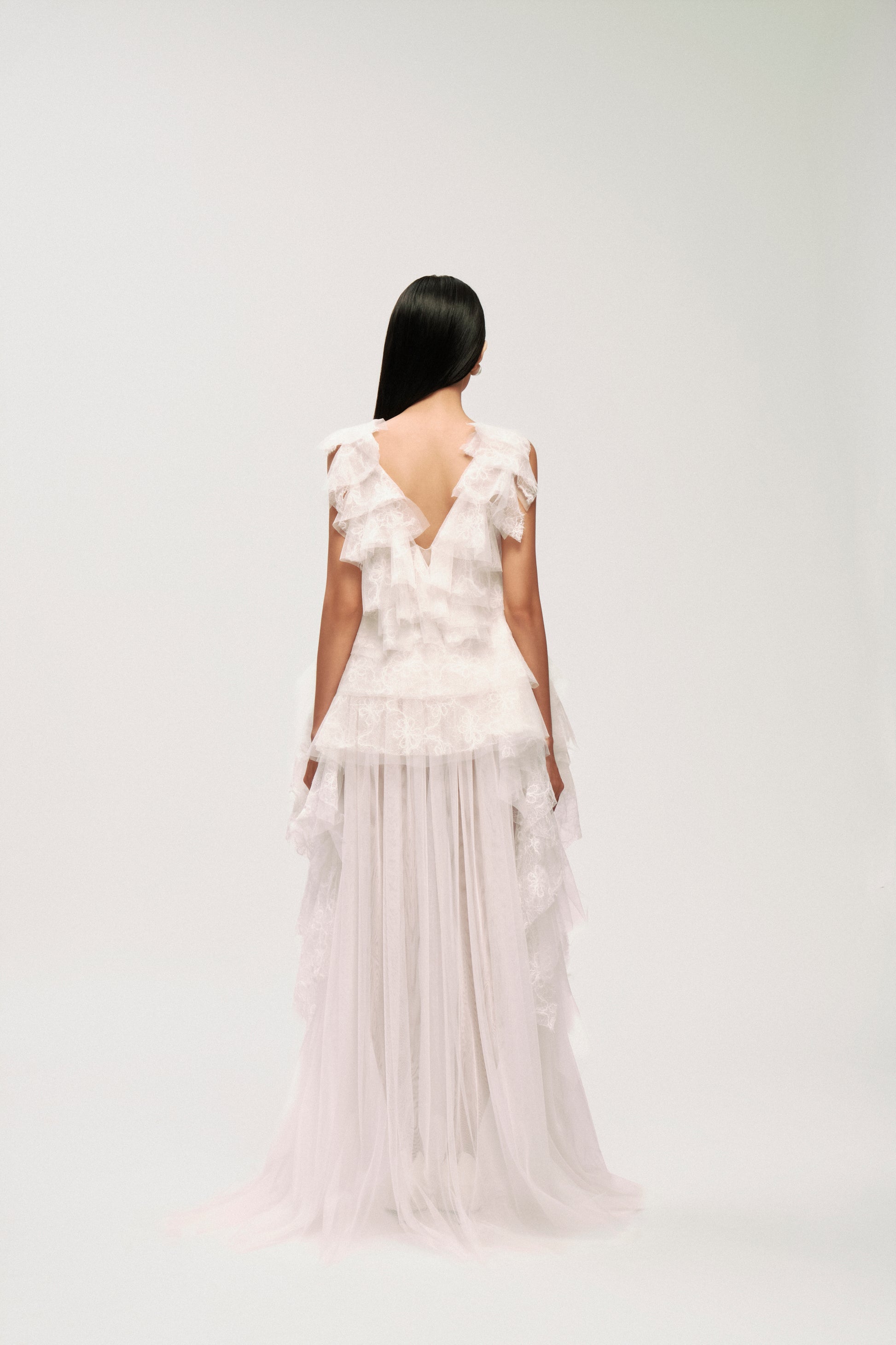 • Skirt Details: Flowing A-line silhouette with layered lace and fine mesh, creating visual depth and a dreamy, floating motion.