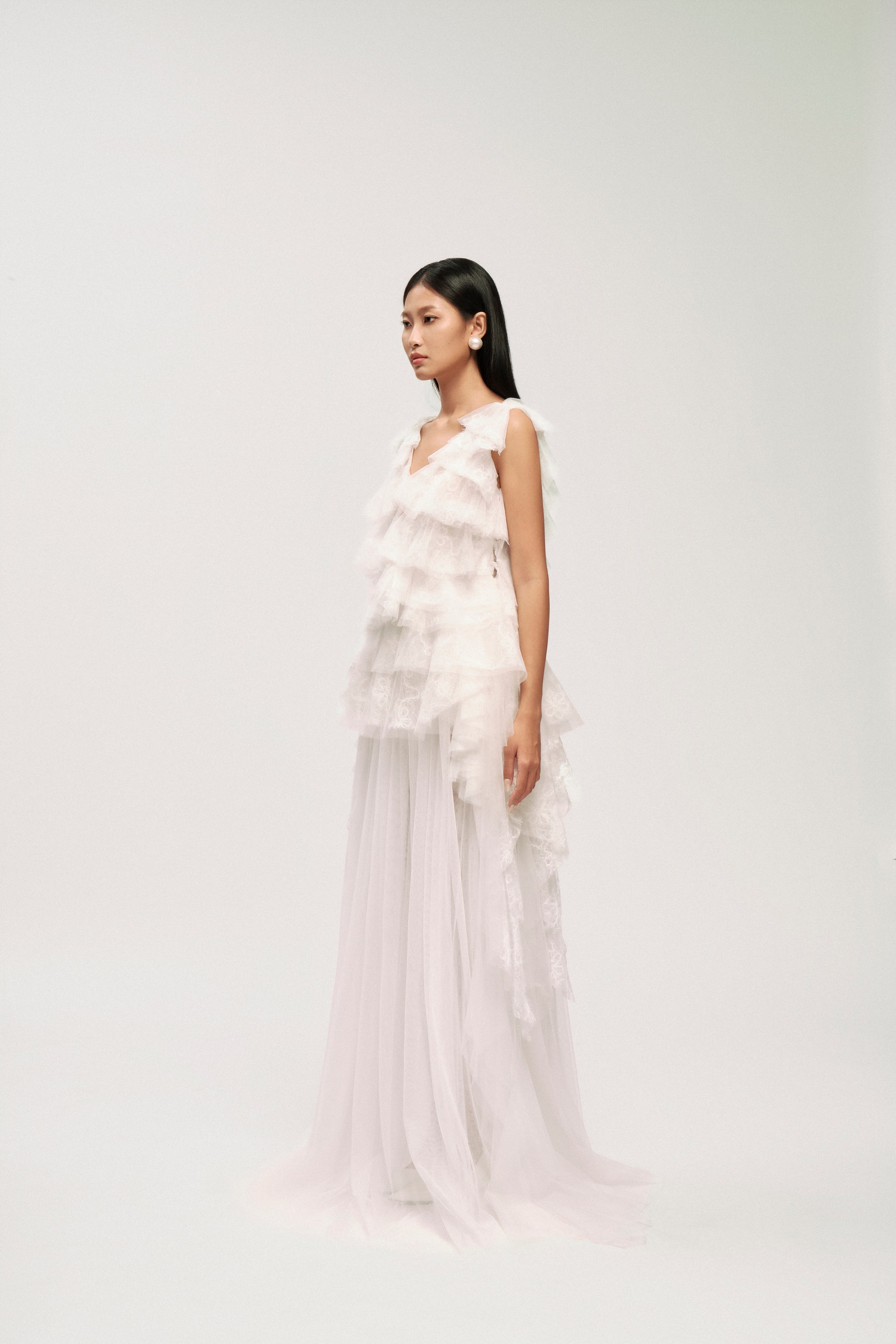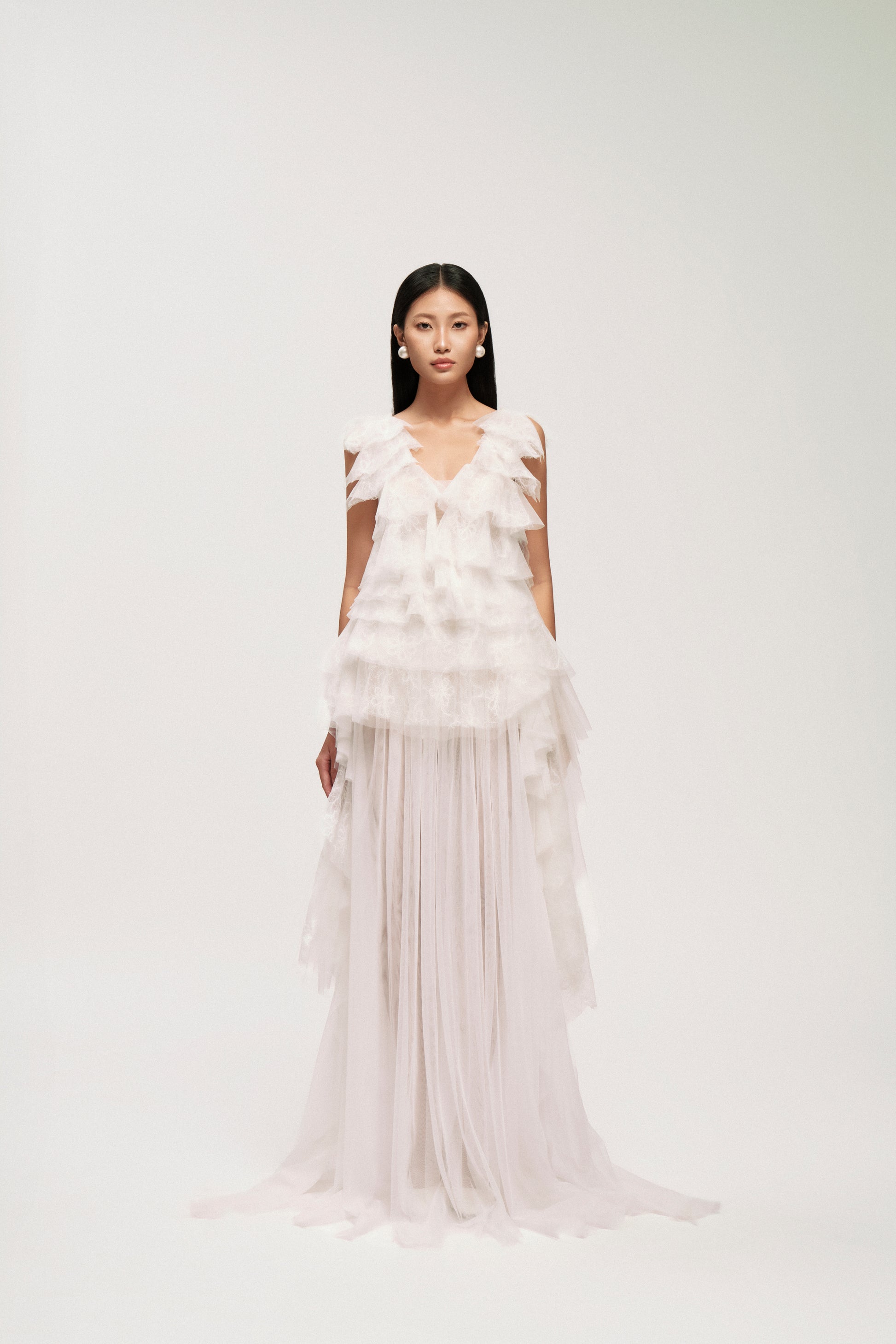 • Phần váy: Dáng dài xoè nhẹ, phủ ren và lưới mảnh nhiều lớp, tạo chiều sâu thị giác và độ bay bổng tự nhiên.