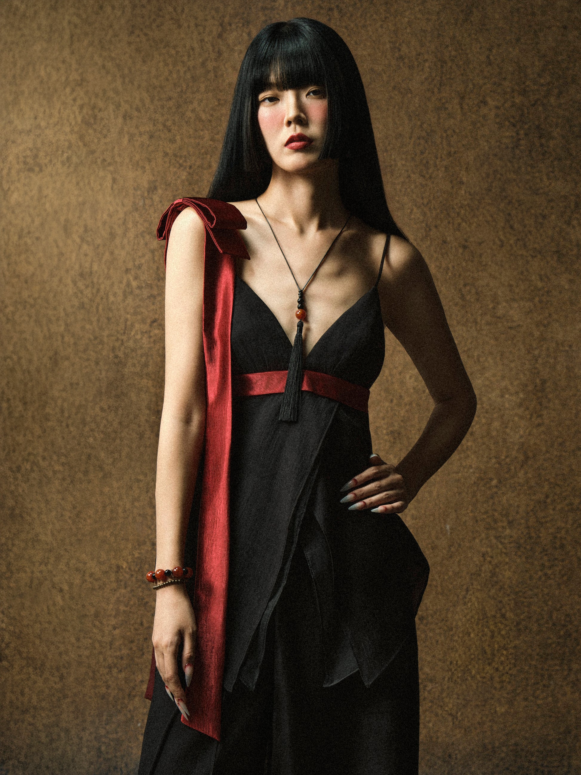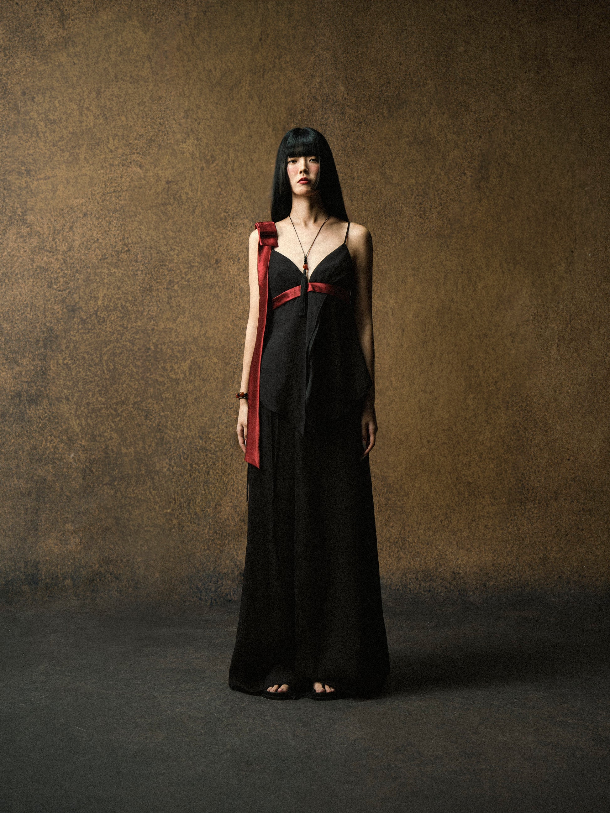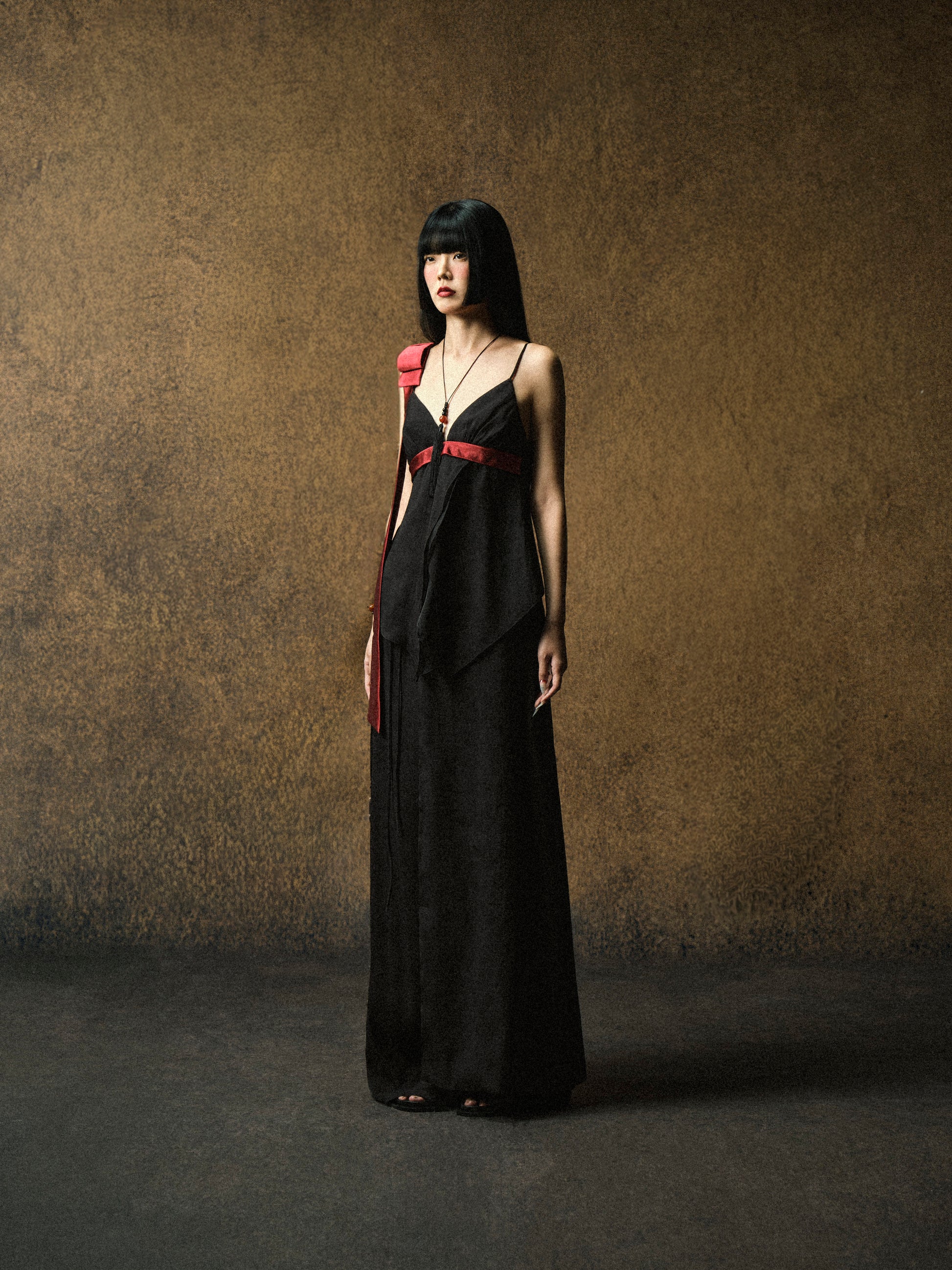 - The top features delicate spaghetti straps and a deep yet refined V-neckline, softly shaping the bust. A bold red silk sash is fixed over one shoulder and cascades down the bodice as a strong visual statement.
