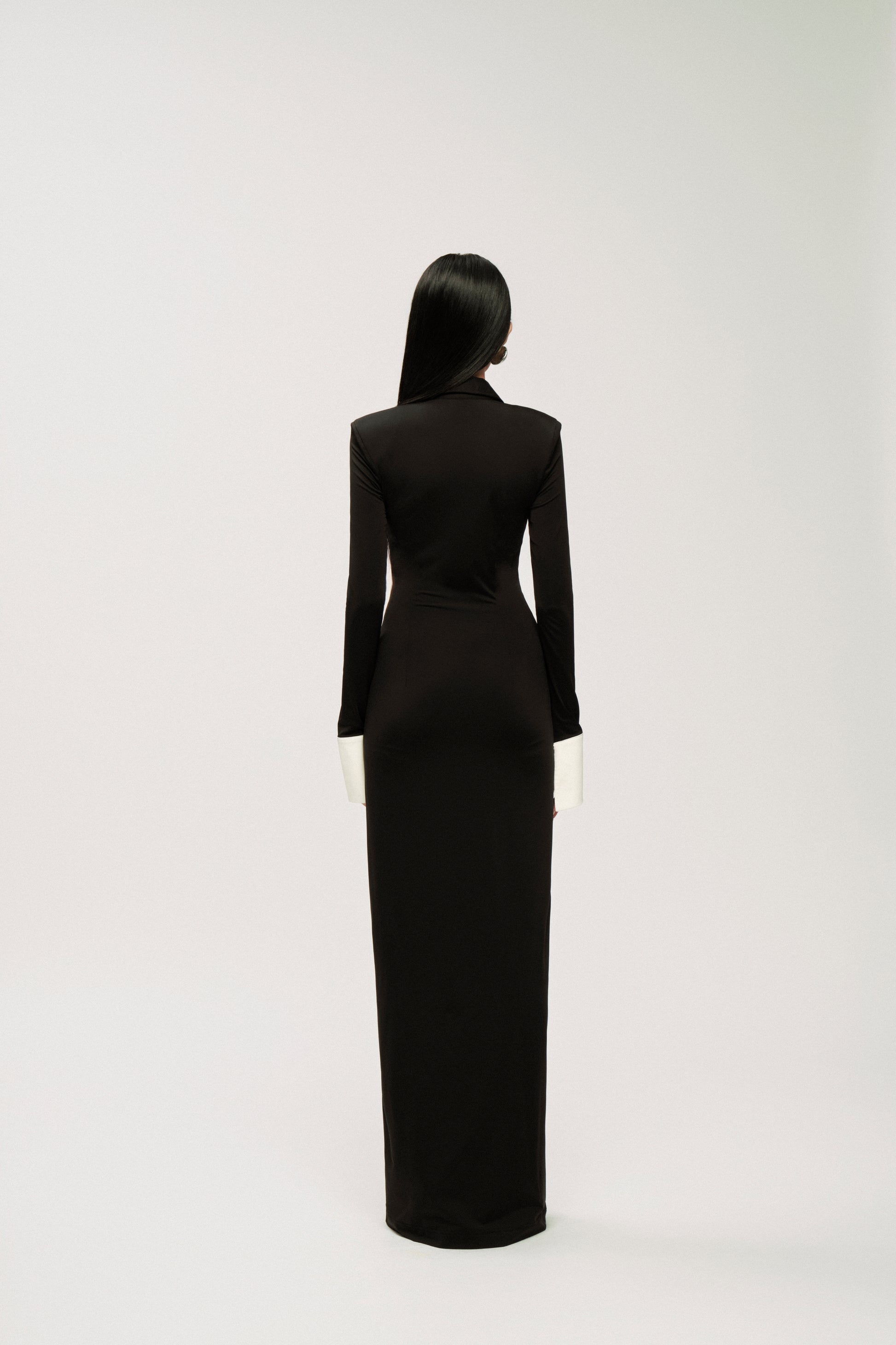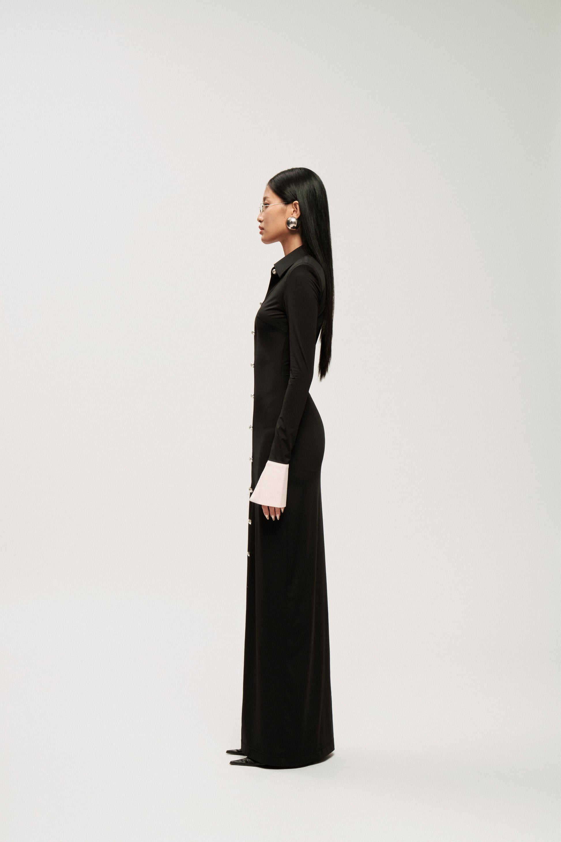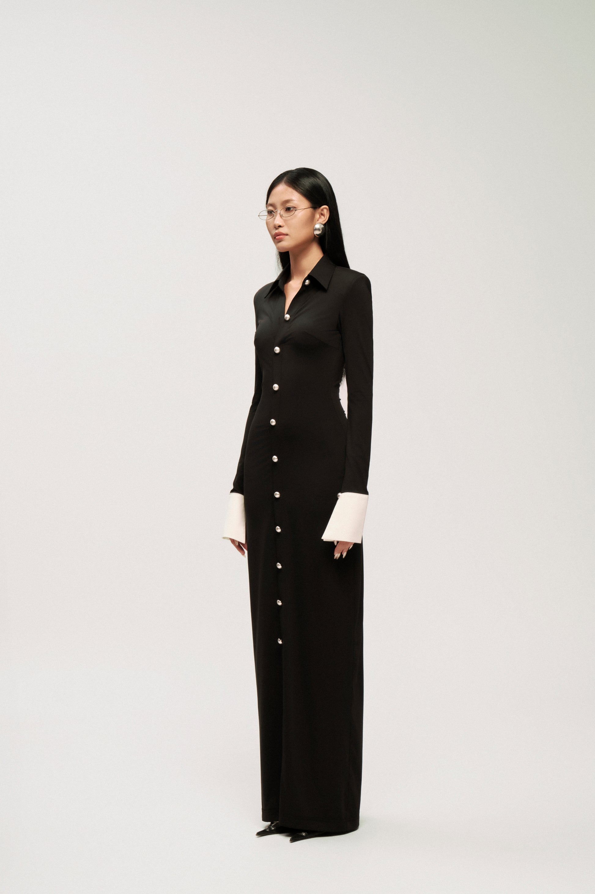 • Product Description: A long, sleek shirt dress with a subtly fitted shape, elevated by a row of pearl buttons along the front. The crisp white collar and elongated sleeves (~70cm) create a striking contrast against the deep black base, blending timeless elegance with contemporary sophistication.