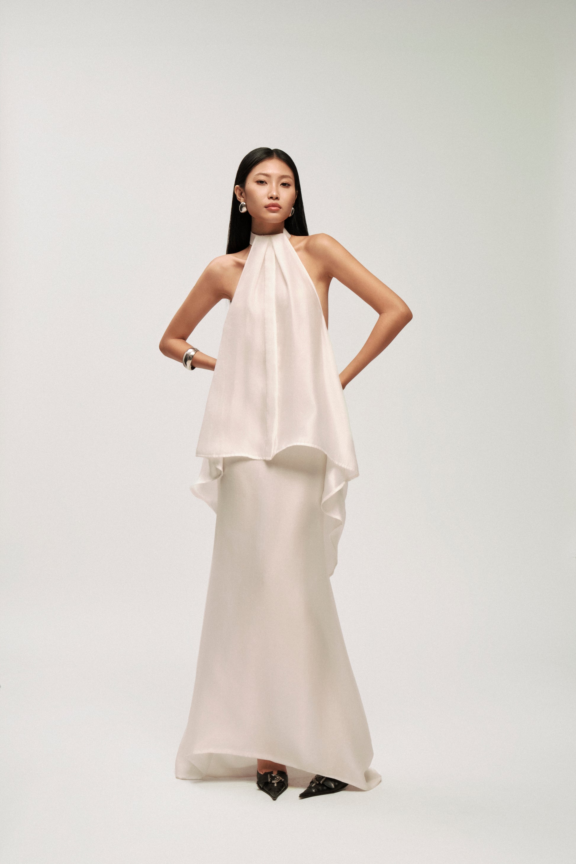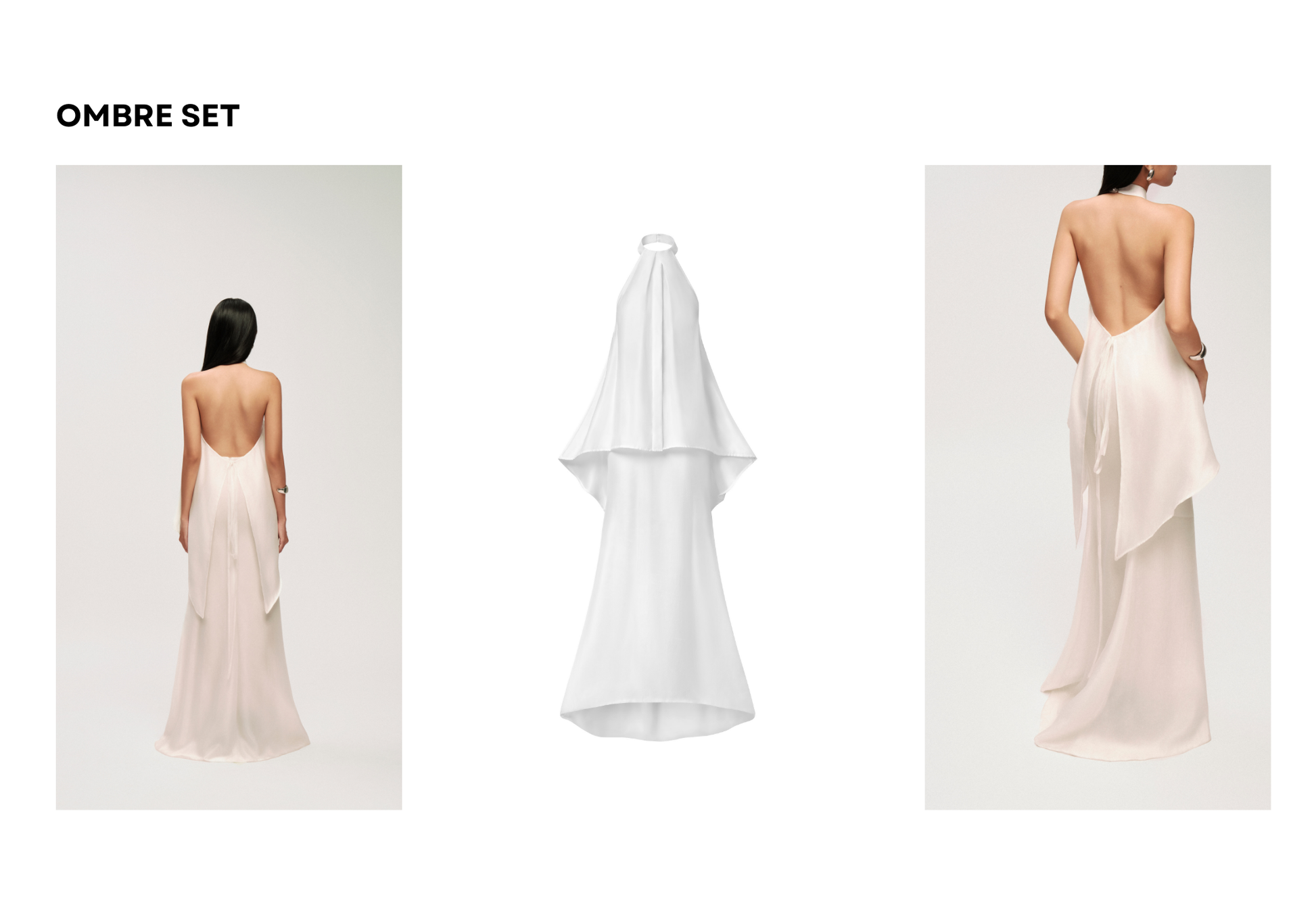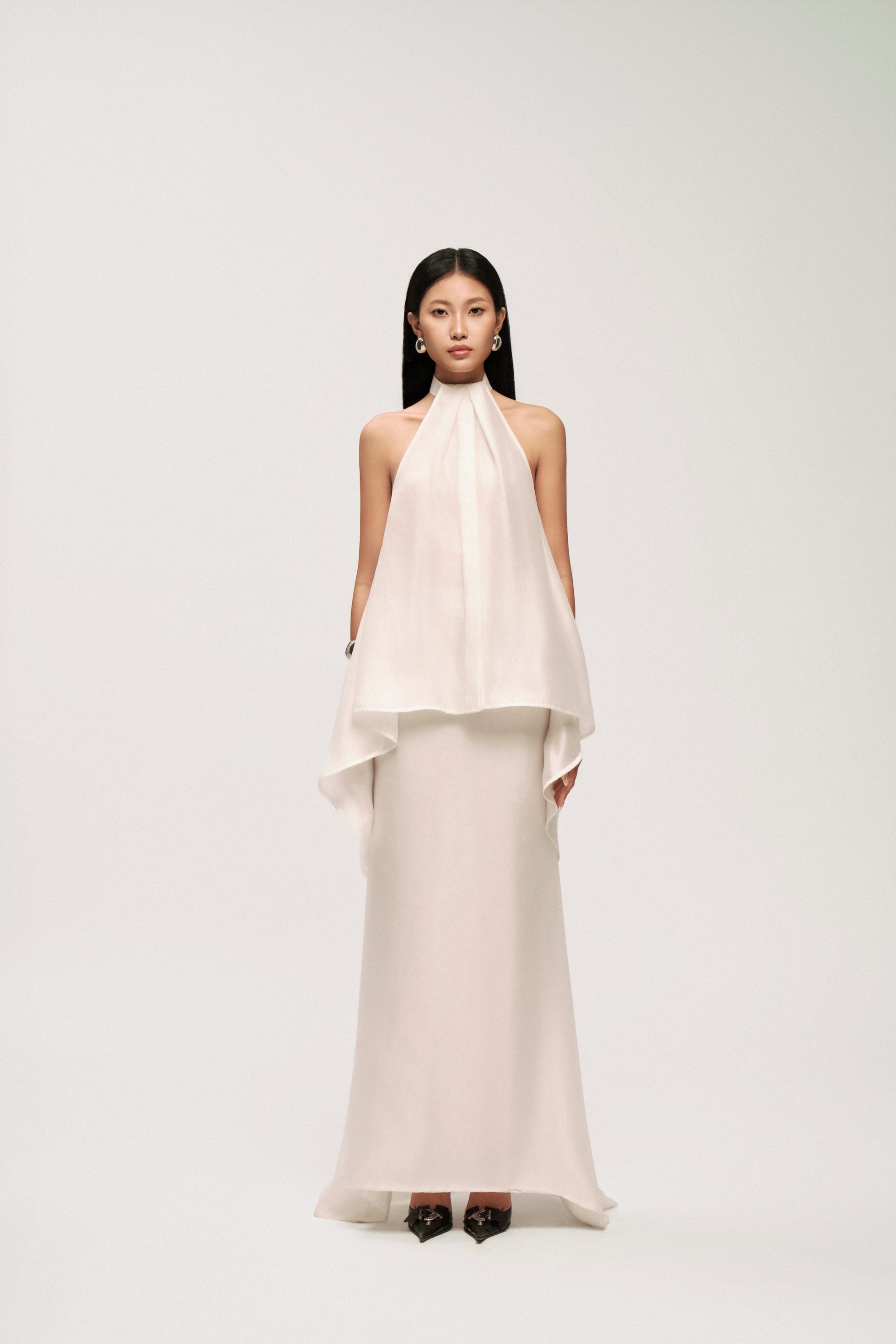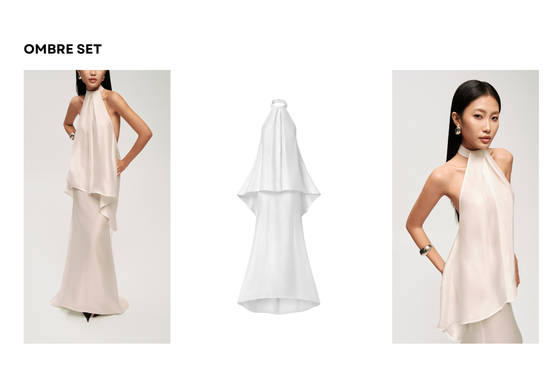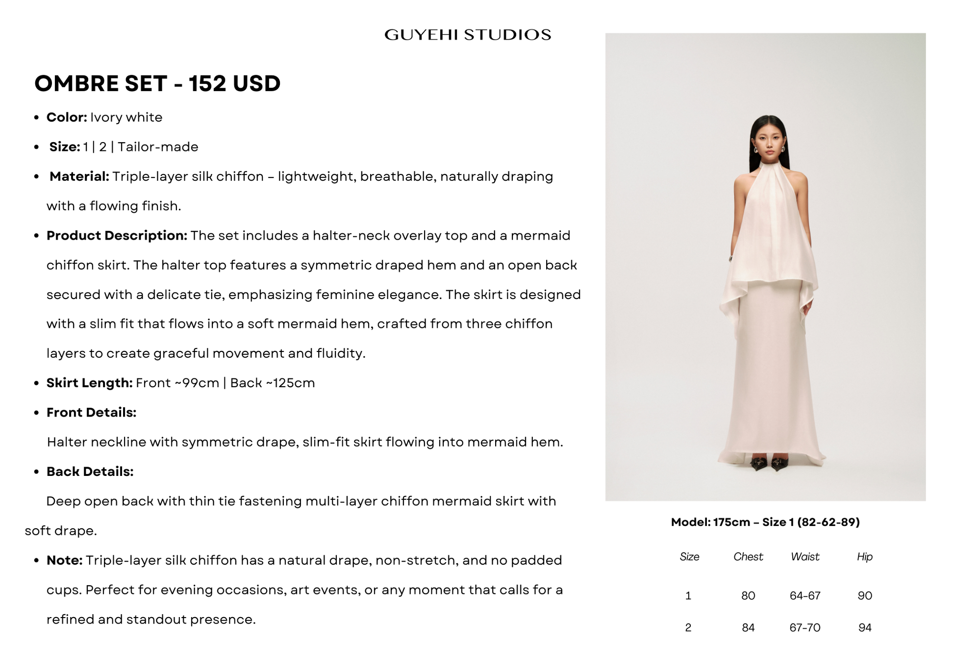 • Product Description: The set includes a halter-neck overlay top and a mermaid chiffon skirt. The halter top features a symmetric draped hem and an open back secured with a delicate tie, emphasizing feminine elegance. The skirt is designed with a slim fit that flows into a soft mermaid hem, crafted from three chiffon layers to create graceful movement and fluidity.