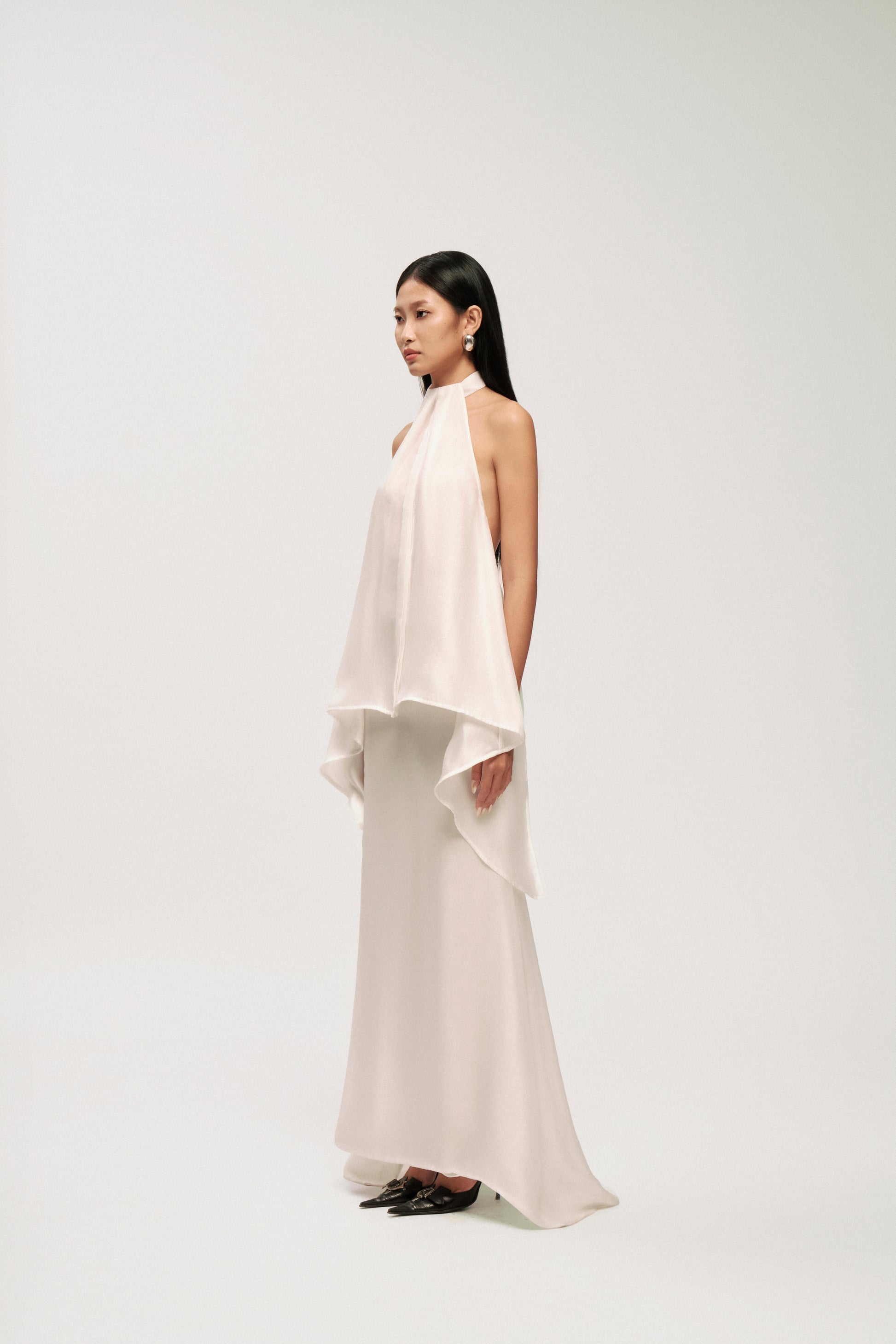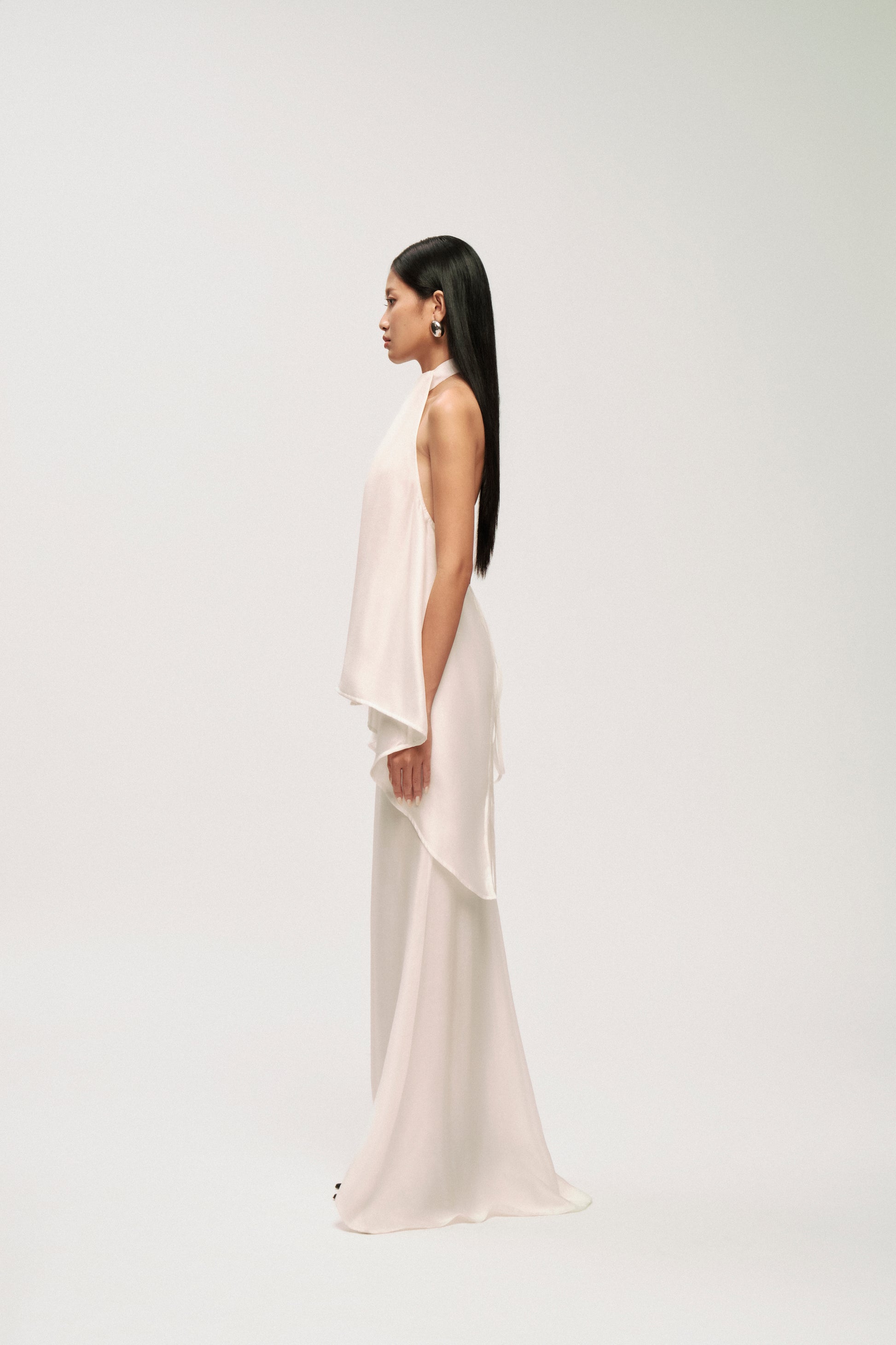 • Front Details: Halter neckline with symmetric drape, slim-fit skirt flowing into mermaid hem.