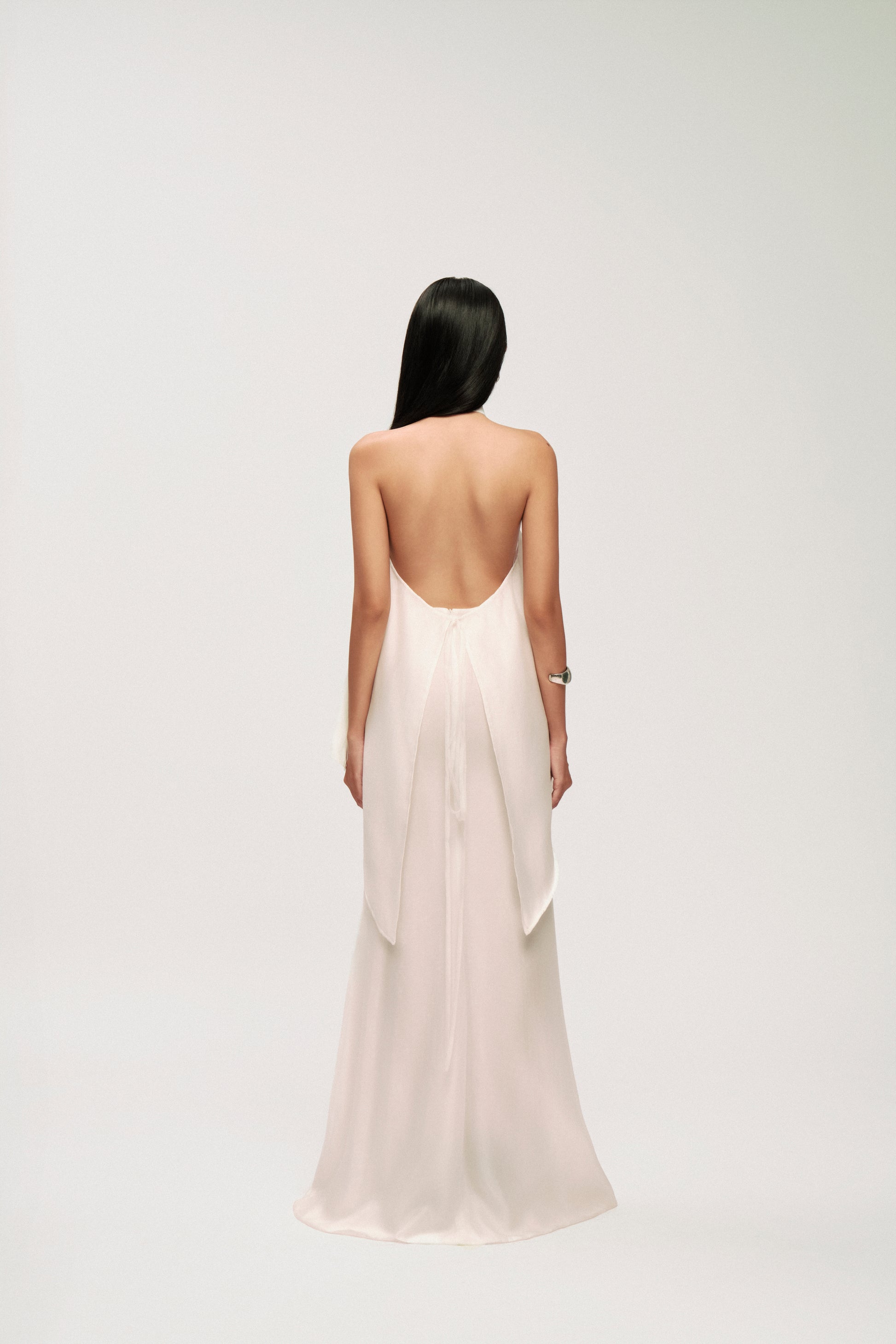 • Back Details: Deep open back with thin tie fastening multi-layer chiffon mermaid skirt with soft drape.