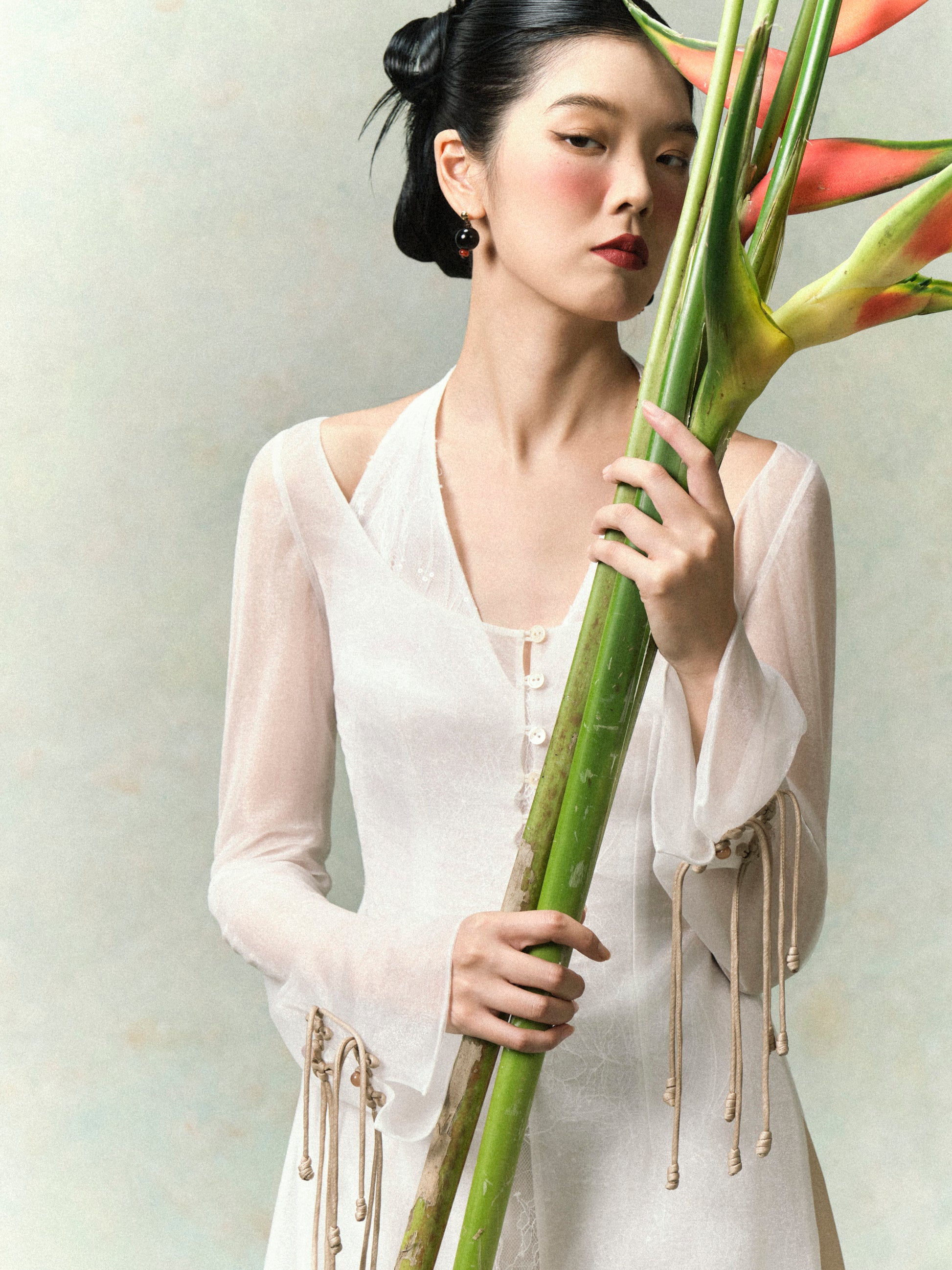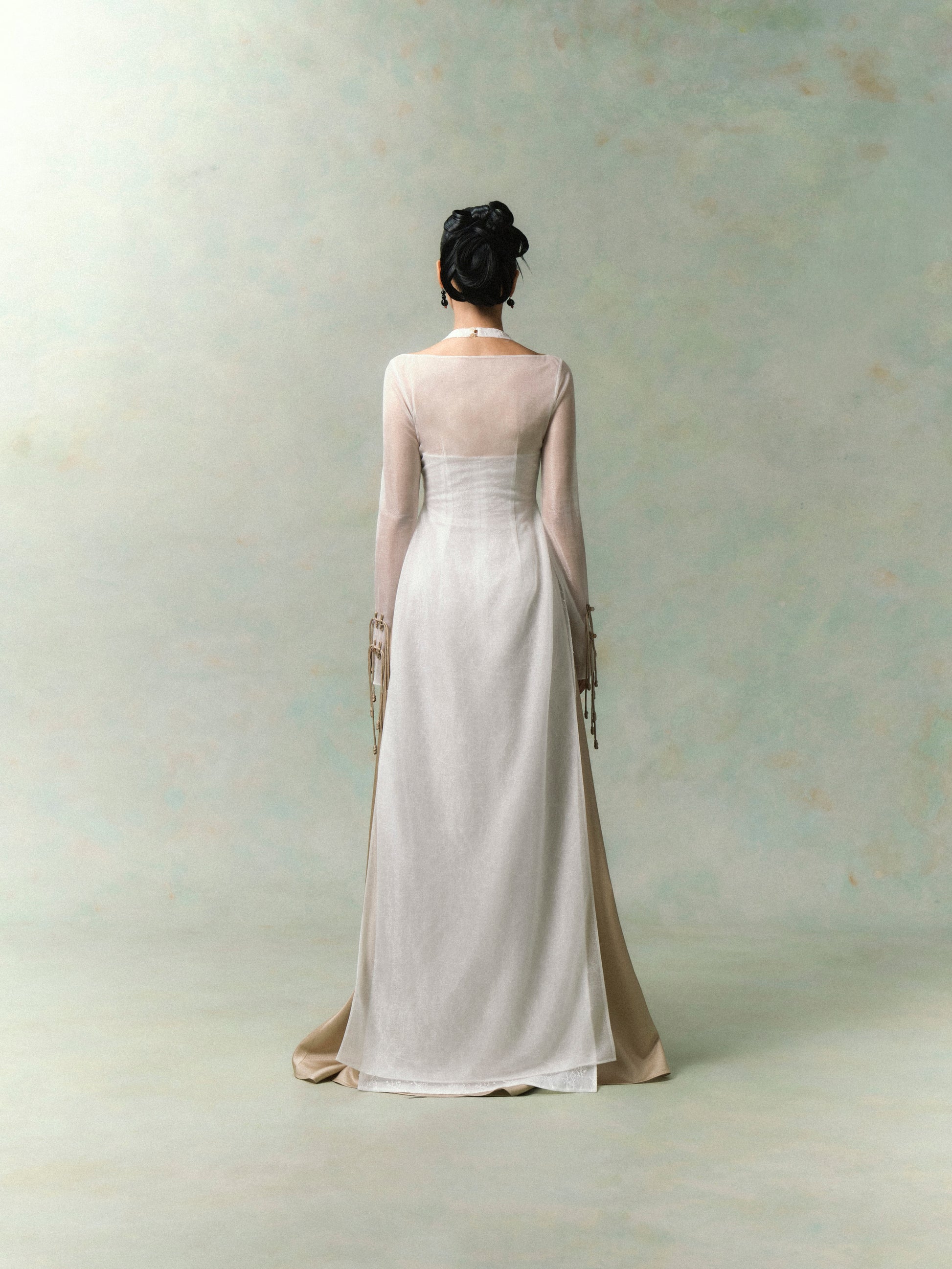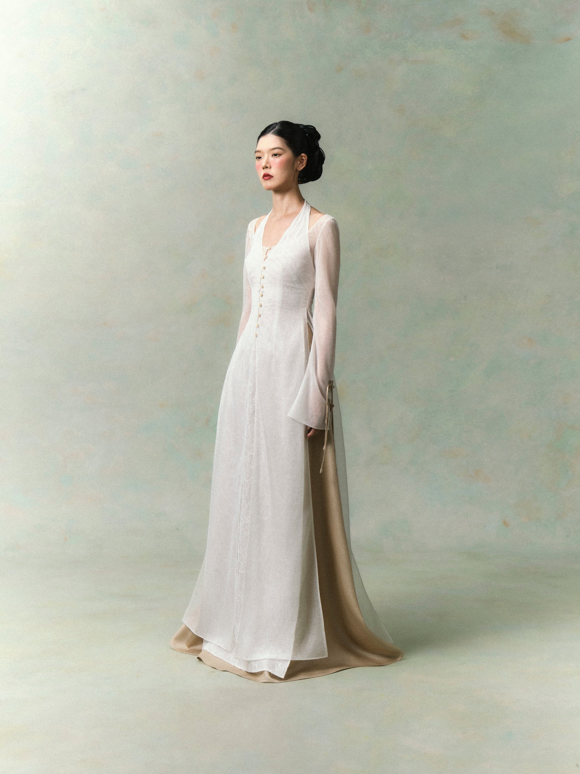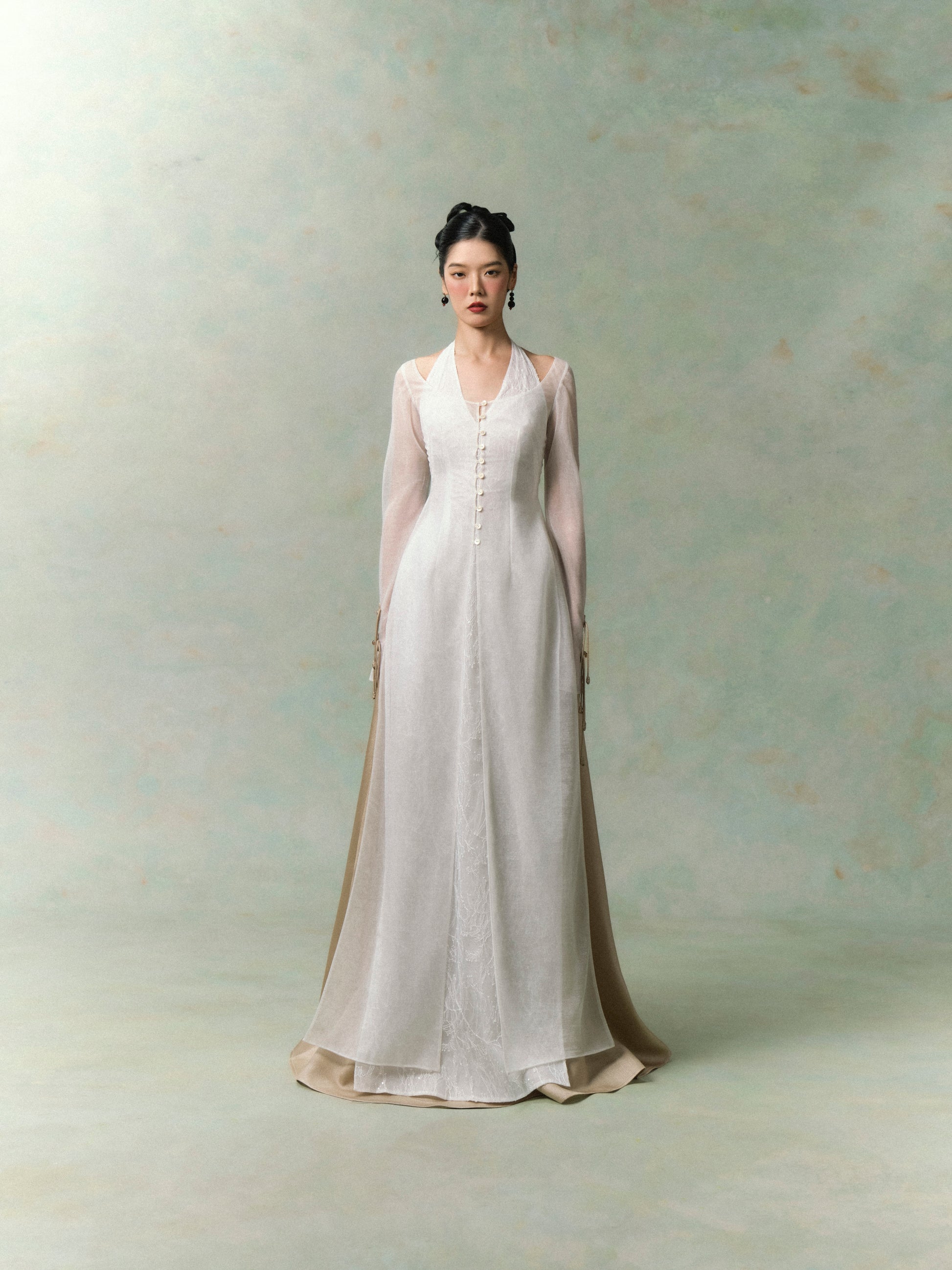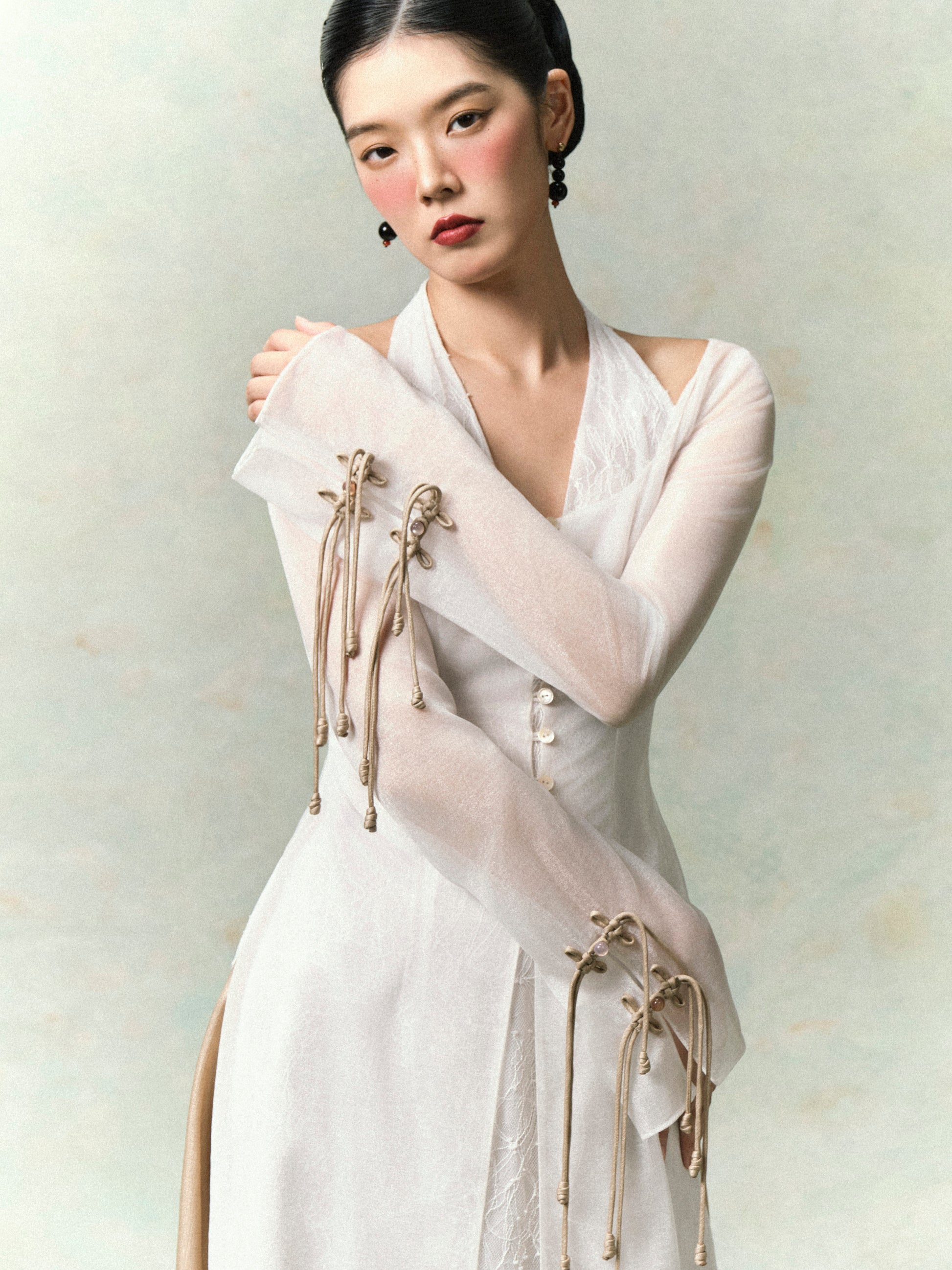 - Outer overlay: Long sheer silhouette with delicate mother-of-pearl buttons along the front. A special highlight is the sleeves, detailed with handcrafted bow knots.