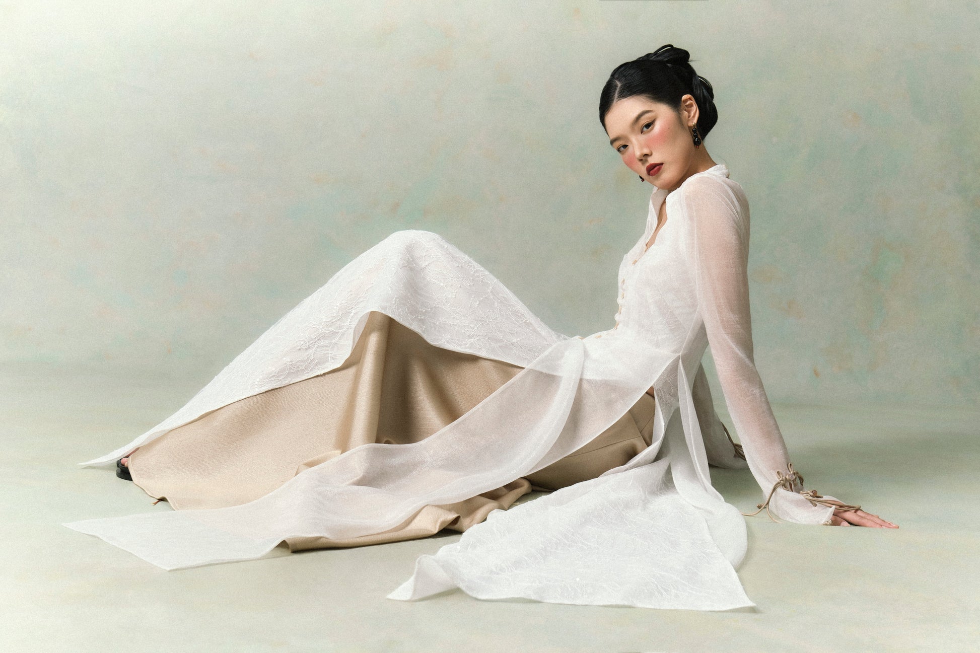 - Phần áo khoác ngoài: Tơ ánh ngọc trai xuyên thấu, mềm rủ và bắt sáng nhẹ.
