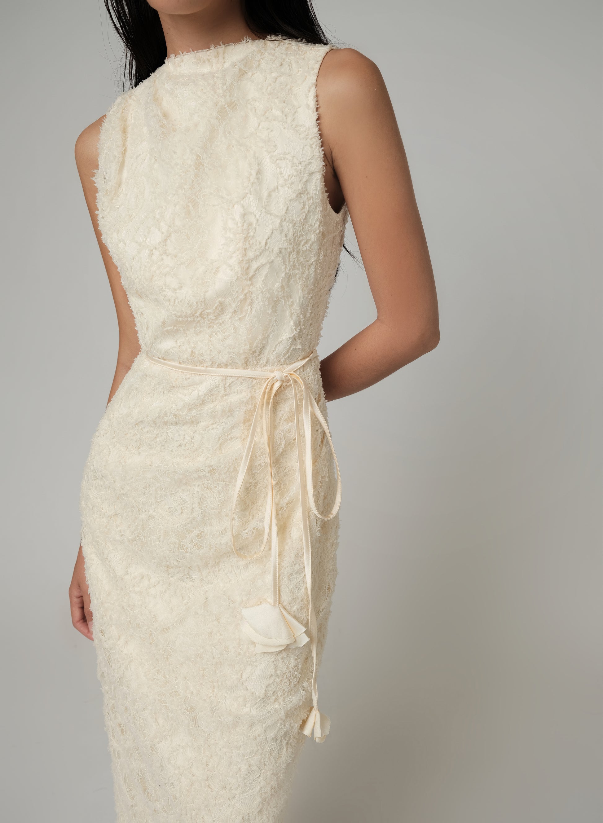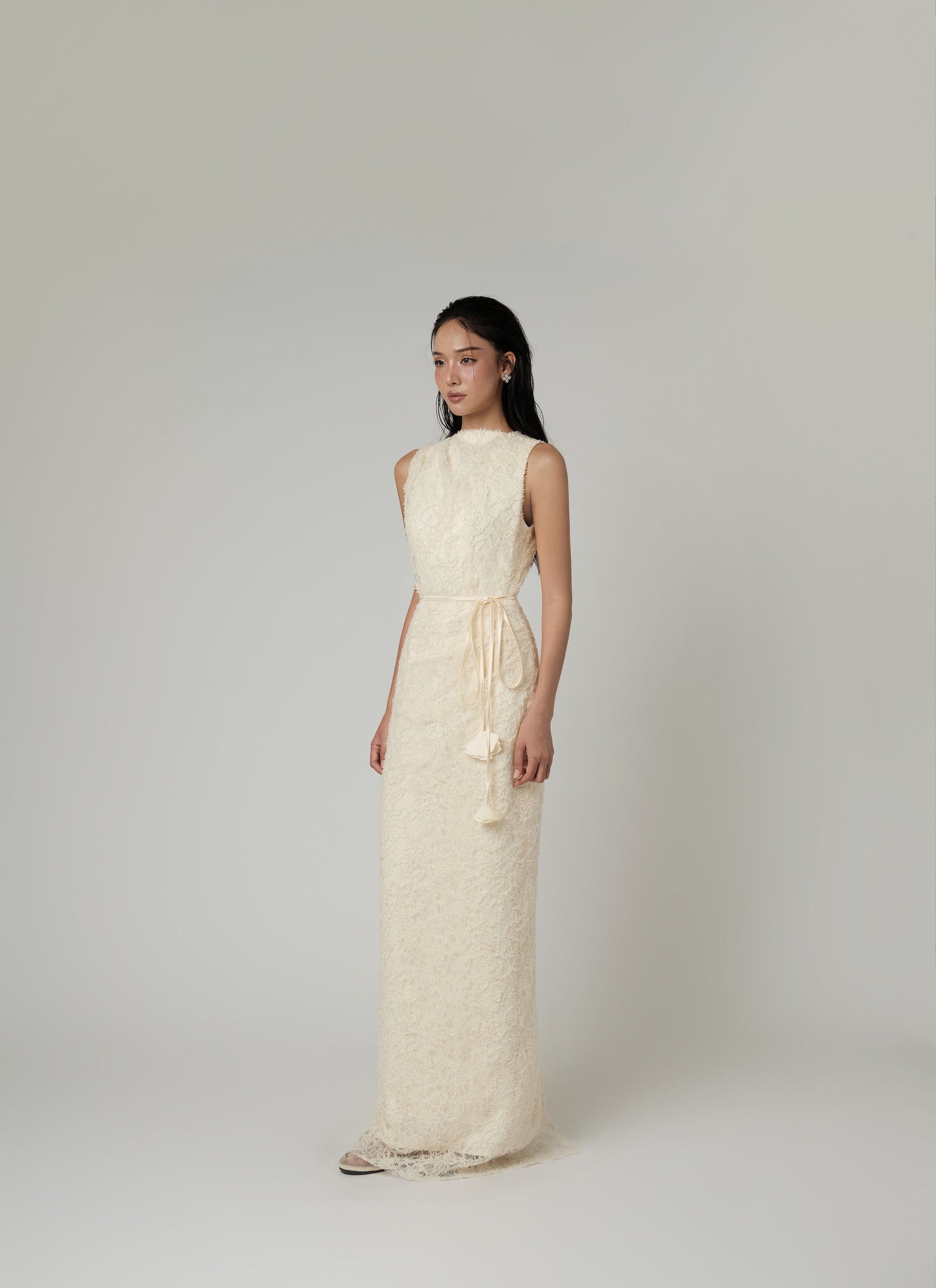 Đặc điểm thiết kế: Thắt lưng nơ rời, khóa kéo sau, xẻ lưng
