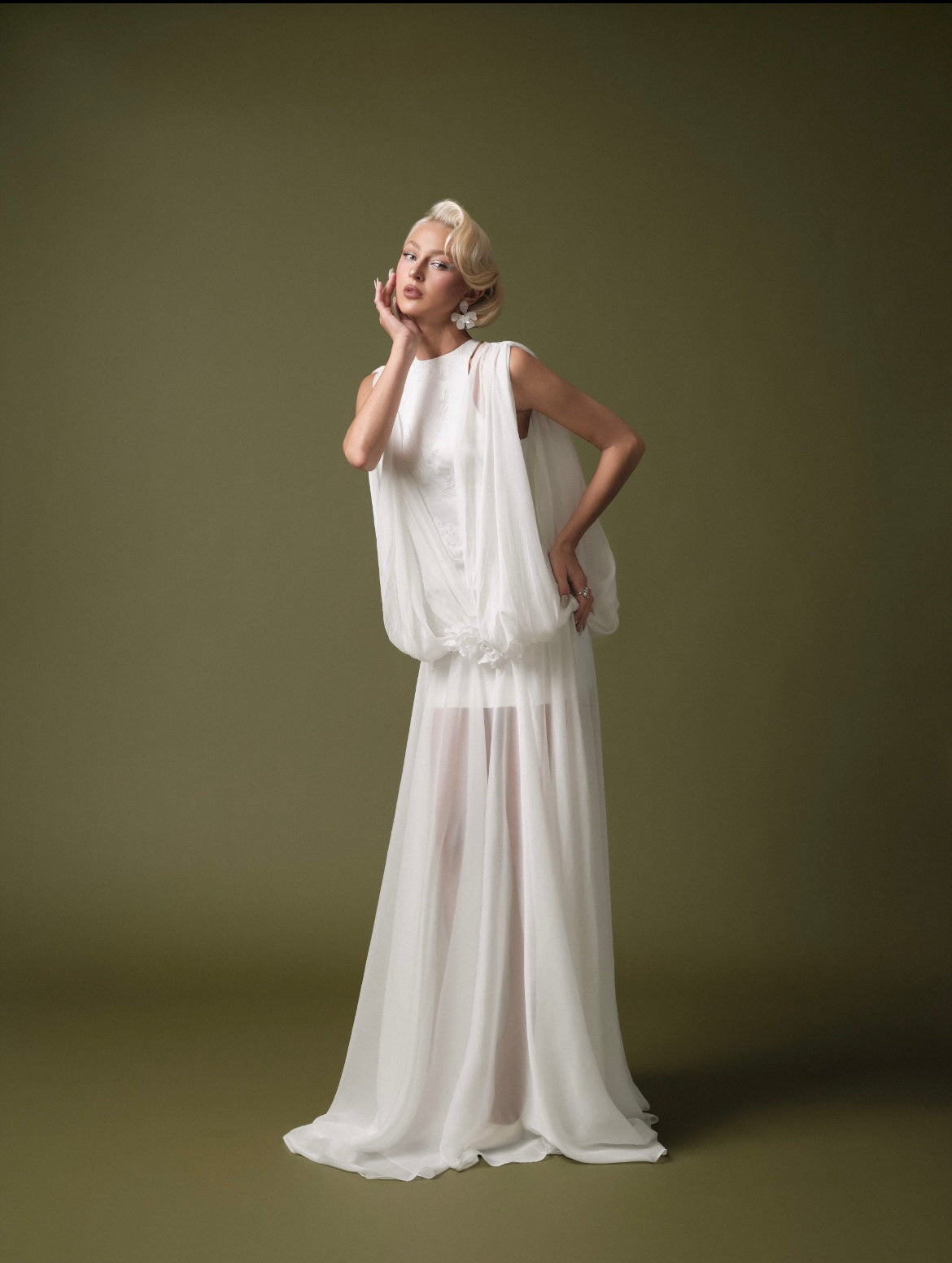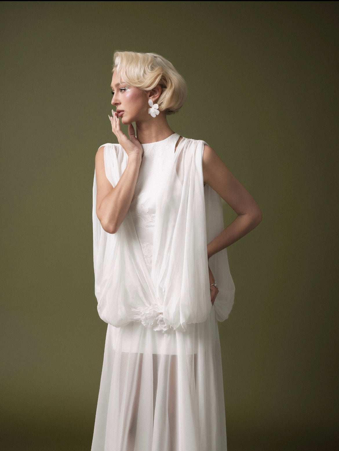 • The chiffon is sewn from the shoulders, flowing down to create a cape effect.